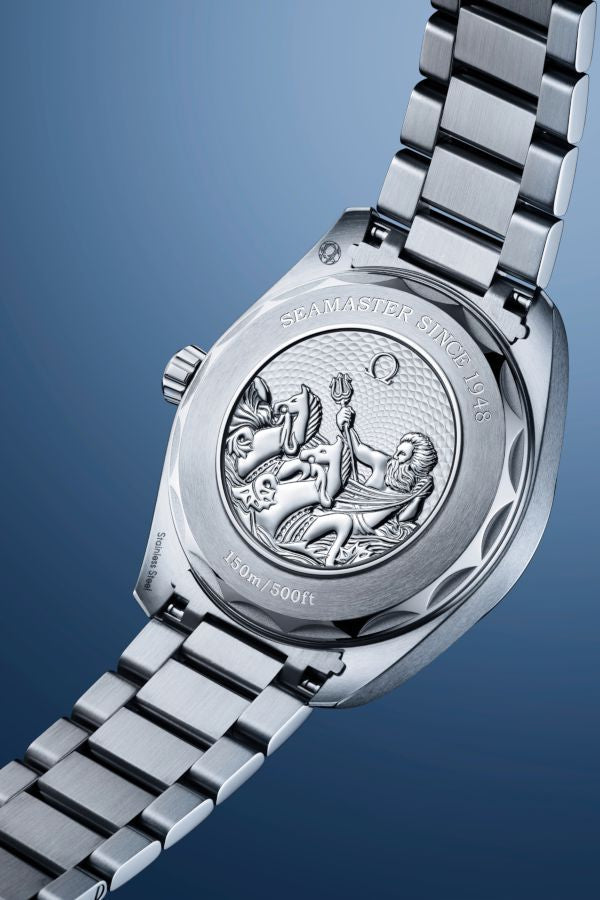 The 43mm Aqua Terra Worldtimer in stainless steel is fitted with a matching strap or blue rubber strap, featuring the stunning OMEGA commemorative caseback.